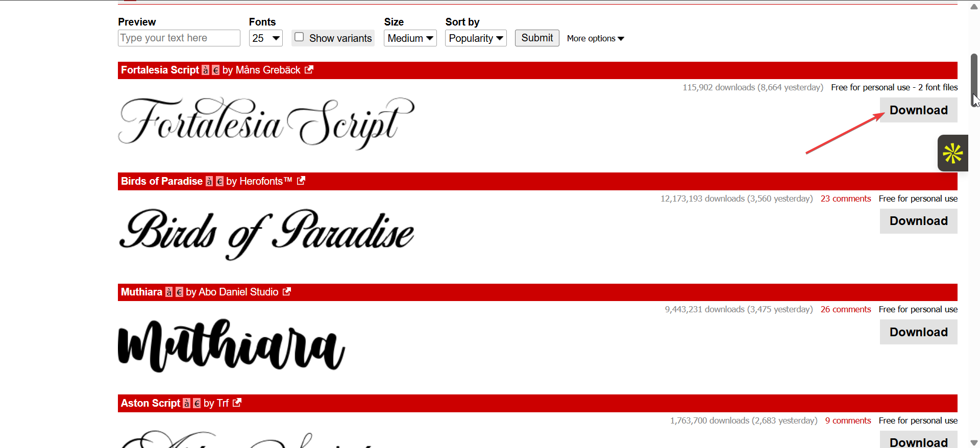 După ce ați ales fontul, faceți clic pe butonul Descărcați din partea dreaptă a ecranului. Fontul se descarcă ca fișier ZIP și apare de obicei în folderul implicit „Descărcări” al browserului. Verificați dimensiunea și numele fișierului pentru a confirma descărcarea cu succes.