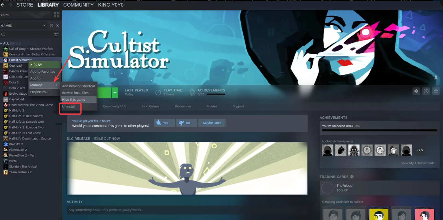 Deschideți Steam și faceți clic pe opțiunea Bibliotecă. Acum, faceți clic dreapta pe joc și selectați Gestionare > Dezinstalare.