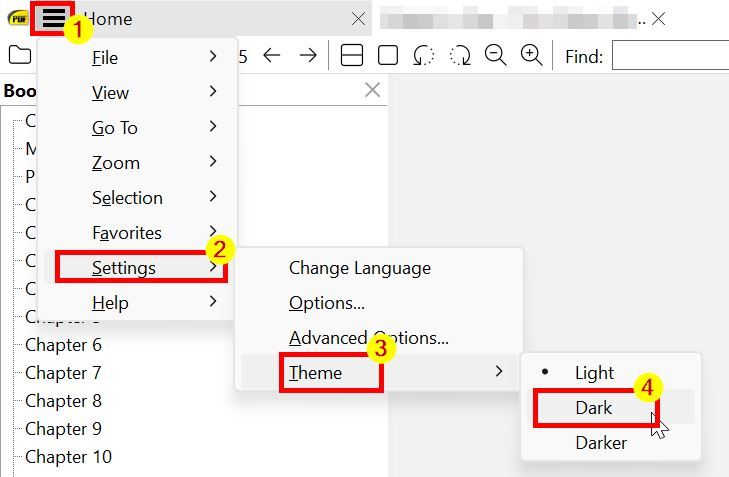 Odată ce aplicația se deschide, faceți clic pe pictograma „Meniu” (trei linii orizontale de sus, apoi selectați colțul de sus, apoi selectați-l pe orizontală) „Setări“> „Temă“> „Întunecat“. Aceasta va activa tema întunecată în SumatraPDF.