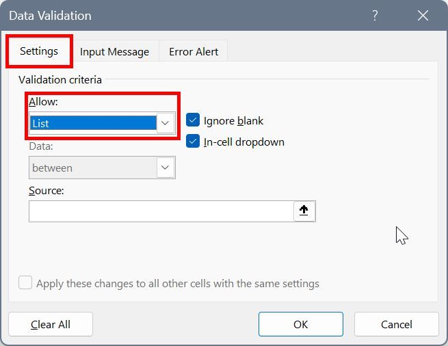 Acțiunea de mai sus deschide caseta de dialog „Validare datelor”. Asigurați-vă că vă aflați în fila „Setări” și selectați „Lista” din meniul drop-down „Permite”.