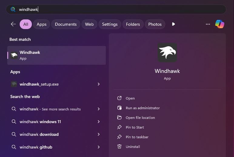 Më pas, hapni menynë Start, kërkoni për”Windhawk“dhe kliko”Hap“.