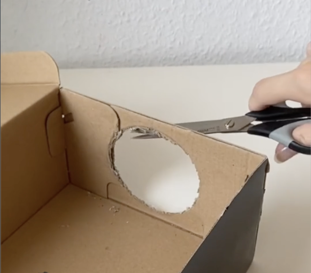 Prisni një vrimë të rrumbullakët në anën e kutisë së këpucëve. Vrima duhet të jetë mjaft e madhe që të përshtatet mirë me xham zmadhues. Vrima duhet të pozicionohet drejt fundit të kutisë (jo në mes), pasi burimi i dritës do të vijë nga iPhone juaj, të cilin do ta vendosni në anën e kundërt.