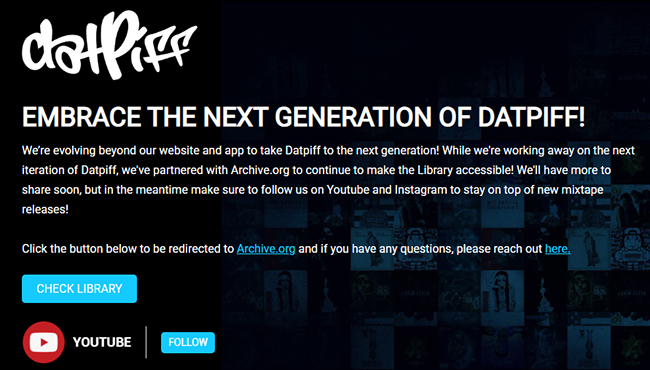 Kompania njoftoi se ata po”evoluojnë përtej”platformës së vjetër për t’u fokusuar në një version të gjeneratës së ardhshme të DatPiff. Ky ndryshim erdhi pas viteve të trafikut në rënie dhe sfidave të vazhdueshme të të drejtave të autorit që ndikojnë në shpërndarjen e mixtape-ve.