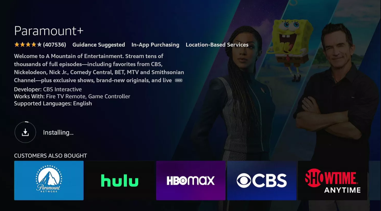 Nga ekrani bazë i Fire TV, zgjidhni Gjeni > Kërko, shkruani Paramount+ dhe zgjidhni Merr. Hapni aplikacionin dhe identifikohuni me llogarinë tuaj Paramount+ për të parë përmbajtjen e Showtime.