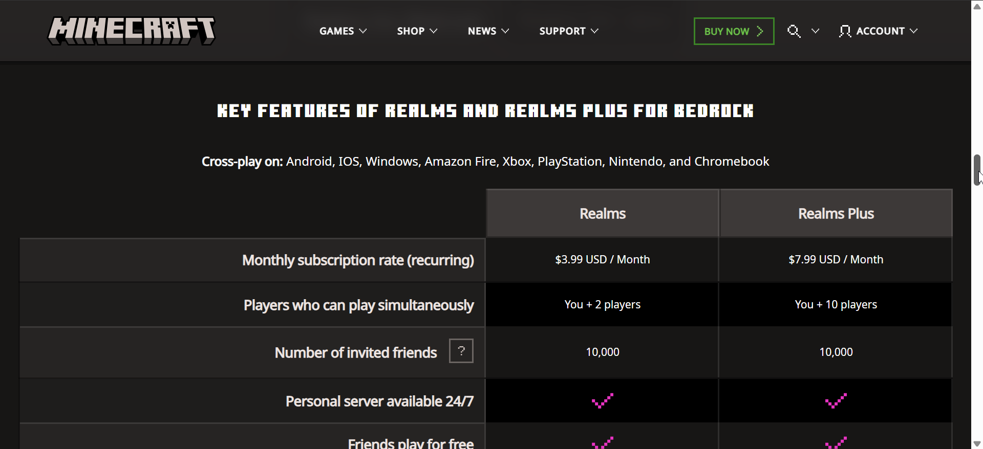 Edicioni Bedrock ofron Realms dhe Realms Plus me çmime të ndryshme mujore. Plani i Realms kushton 3,99 dollarë në muaj ndërsa Realm Plus kushton 7,99 dollarë në muaj në kohën e shkrimit. Kjo ju lejon të bashkoheni nga Windows, Xbox, PlayStation, Nintendo Switch dhe celular. Mbështetja ndër-platformë e bën më të lehtë për grupet me pajisje të përziera të luajnë së bashku.