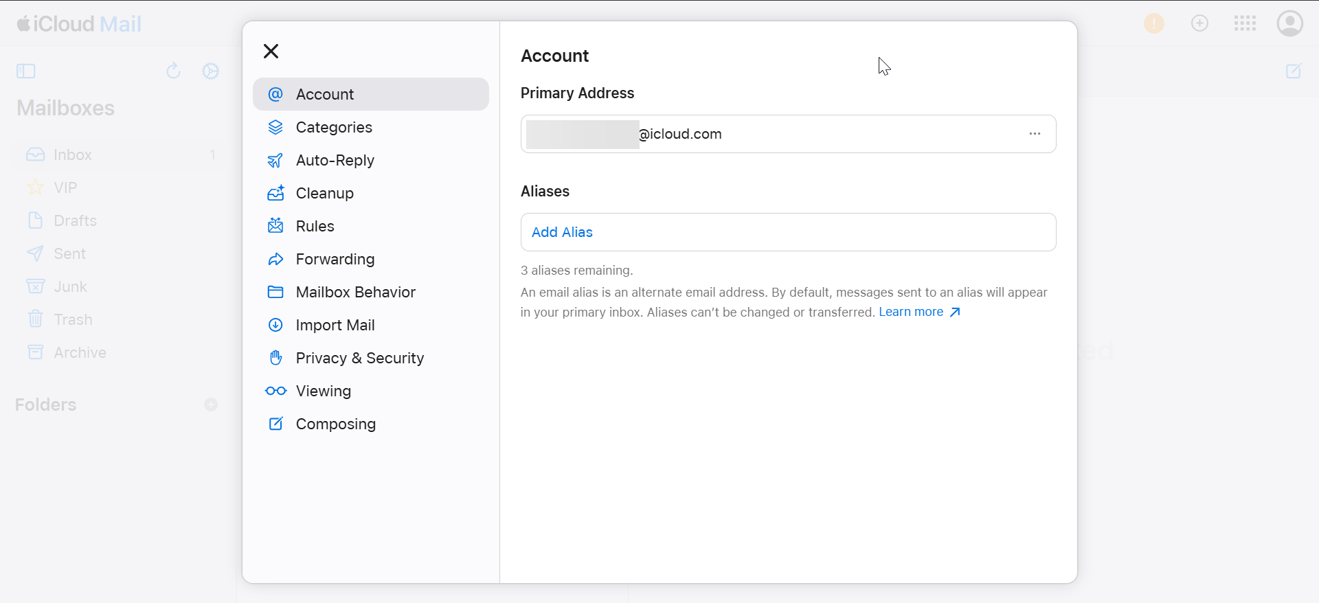 Hap iCloud Mail, kliko ikonën Cilësimet dhe zgjidh Cilësimet e llogarisë. Apple tregon adresën tuaj iCloud nën seksionin Apple ID.