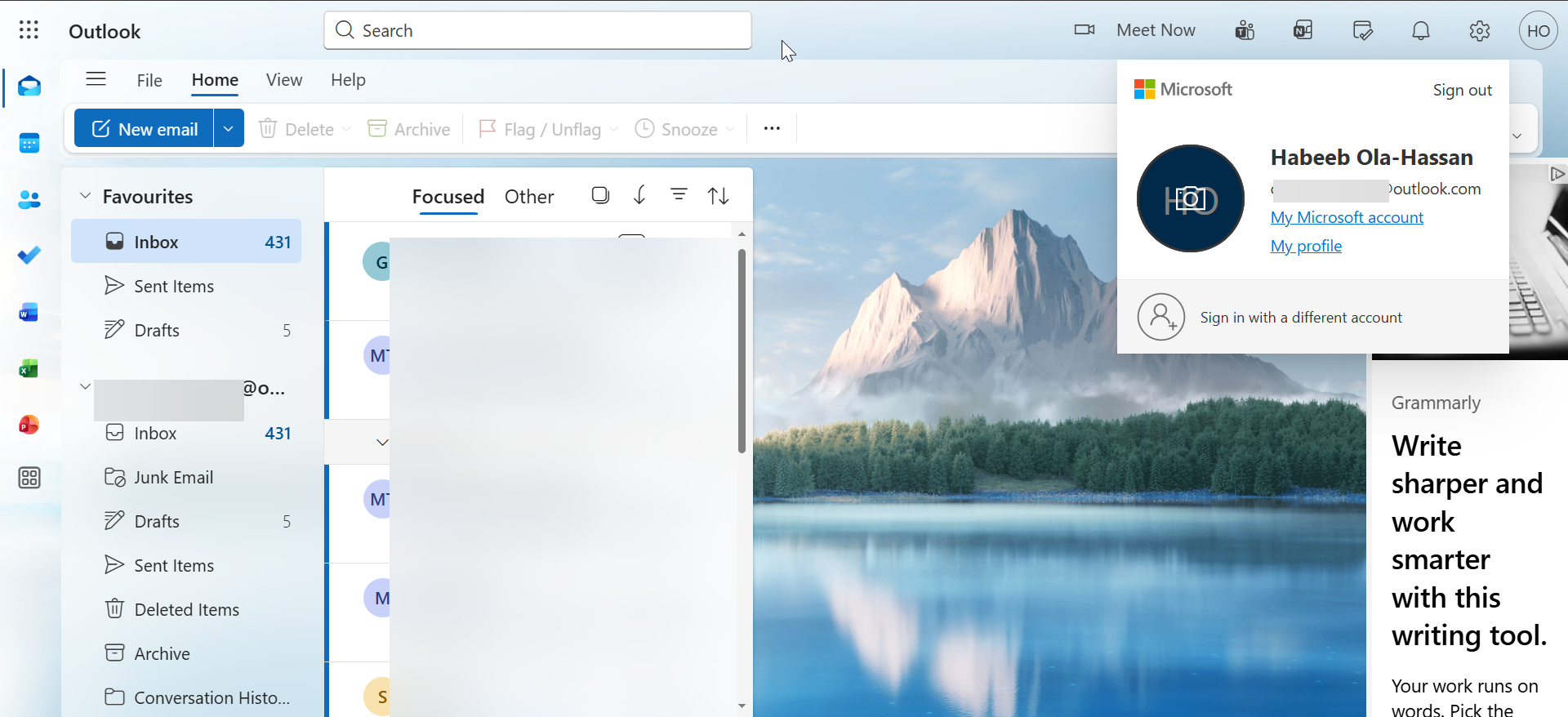 Kliko ikonën e profilit tënd dhe Outlook shfaq adresën e plotë të lidhur me gjerësinë e llogarisë suaj të Microsoft8="8"8="8"8="Microsoft".>