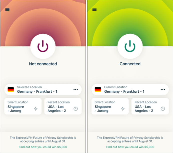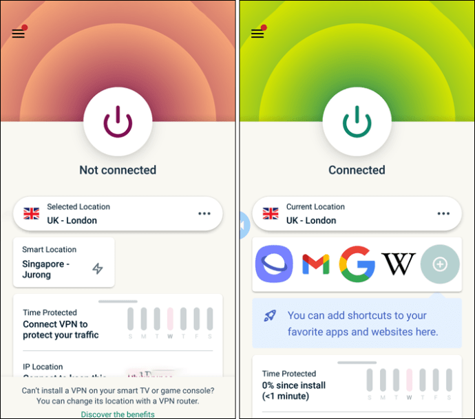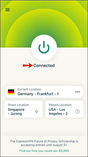 Trokitni lehtë mbi ikonën e energjisë në ekranin tuaj për të lidhur VPN dhe për të ndryshuar internetin në vendin tuaj të zgjedhur. Ikona e energjisë do të ketë një rreth të kuq rreth saj kur të shkëputeni. Do të shihni një rreth të gjelbër kur lidheni me një mesazh”I lidhur”poshtë tij.
