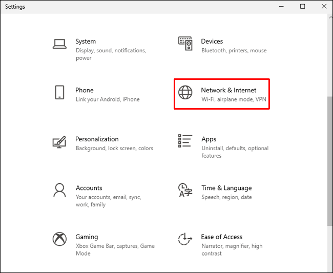 Zgjidhni”Cilësimet.”Klikoni”Rrjeti dhe Interneti.”