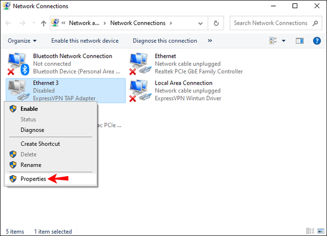 Tani gjeni lidhjen e rrjetit me emrin e VPN-së tuaj; ka të ngjarë të quhet”Rrjet i paidentifikuar”ose diçka e ngjashme. Thjesht gjeni rrjetin me”ExpressVPN”në emrin e tij. Klikoni me të djathtën mbi lidhjen, më pas kliko”Properties.”