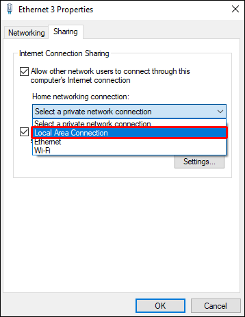 Zgjidhni”Local Area Network”nga menyja tërheqëse”Home Networking Connection”në fund. Bërja e kësaj përzgjedhjeje ju mundëson të ndani lidhjen tuaj përmes Ethernet.