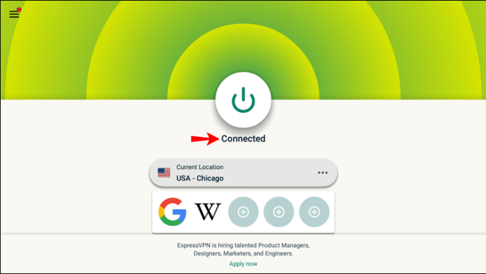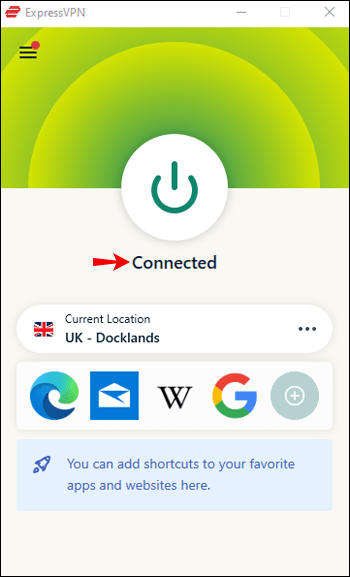 Klikoni emrin e lidhjes së internetit që konfiguroni nga menyja tërheqëse, më pas”OK.”Hapni aplikacionin ExpressVPN dhe lidheni me serverin për vendin që dëshironi. Klikoni Power butonin dhe më pas do të shfaqet një mesazh”I lidhur”poshtë tij.
