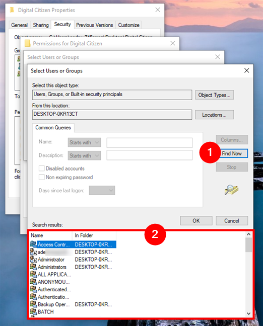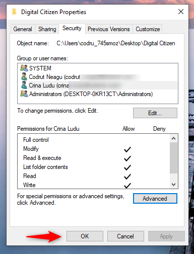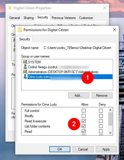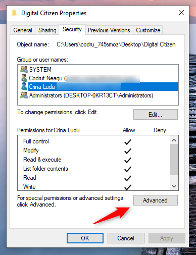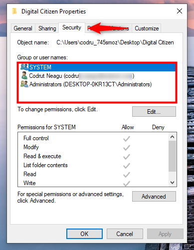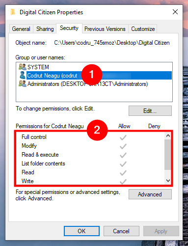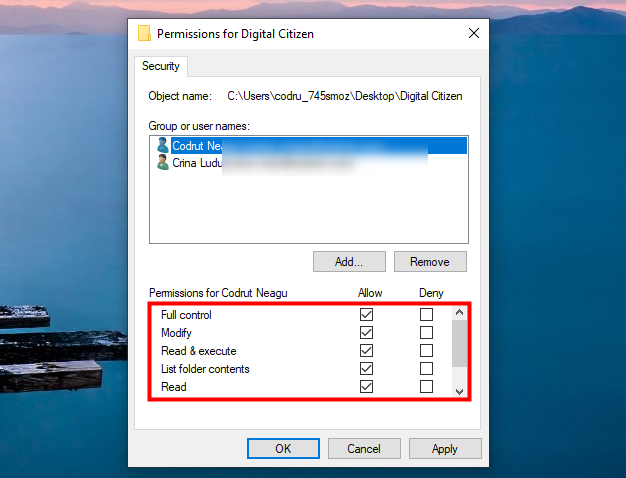 Välj ett användarkonto eller en grupp från listan överst, så kan du se de specifika behörigheter som tilldelats dem i den nedre delen av fönstret, under Behörigheter för [användare/grupp]. Till exempel, i nästa skärmdump kan du se att jag har full kontrollbehörighet att göra vad jag vill med min Digital Citizen-mapp. 🙂