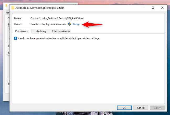 Detta öppnar Avancerat Fönstret Säkerhetsinställningar. Överst bör du se den nuvarande ägaren av filen eller mappen, men om något inte stämmer kan du bara se ett meddelande som Kan inte visa nuvarande ägare. Hur som helst, för att fortsätta och byta ägare, klicka eller tryck på länken Ändra bredvid ägarens namn.