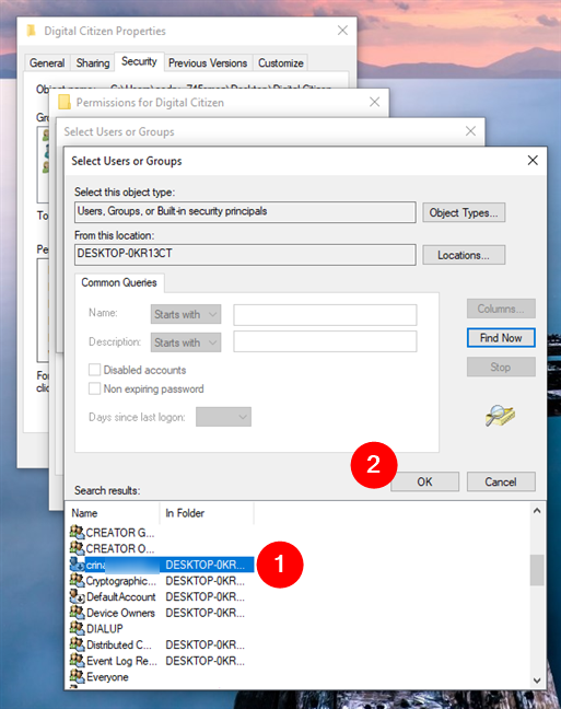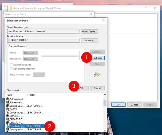 Tryck sedan på Hitta nu för att bläddra igenom listan över tillgängliga användare och grupper. Välj den du vill ge äganderätten till och klicka eller tryck på OK.