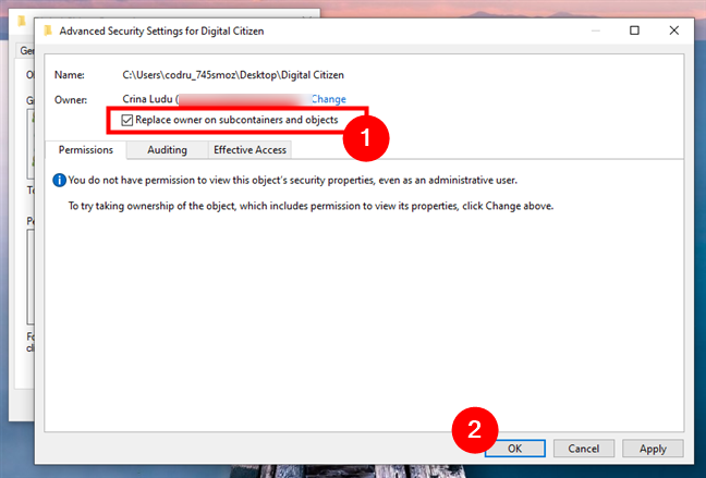 Tillbaka i de avancerade säkerhetsinställningarna fönster, det finns ett alternativ som heter Ersätt ägare på underbehållare och objekt: markera den här rutan om du vill ta äganderätten till alla mappar och filer i katalogen. Slutför sedan ägarbytet genom att klicka eller trycka på OK-knappen.