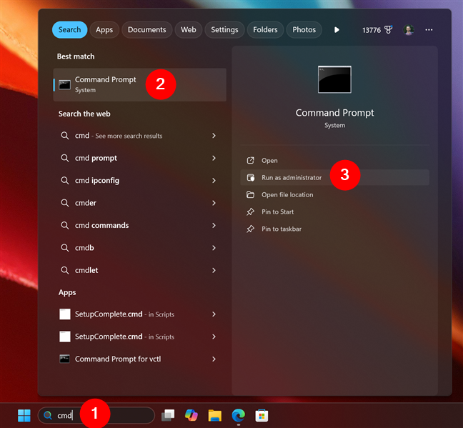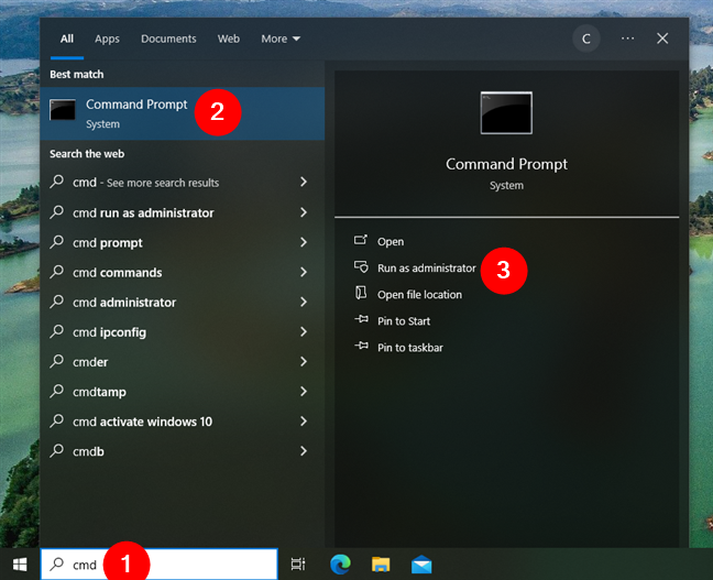 För att komma igång, öppna kommandotolken med administratörsrättigheter. Ett snabbt sätt att göra det skulle vara att skriva cmd i sökrutan i aktivitetsfältet, välja Kommandotolken och klicka eller trycka på Kör som administratör till höger om sökpanelen. Så här ser det ut i Windows 10: