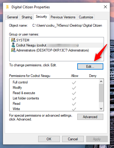 Om du behöver ändra behörigheterna för en fil eller mapp, på fliken Säkerhet från objektets egenskaper, klicka eller tryck på knappen Redigera.