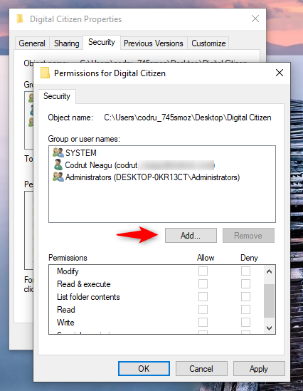 Om användaren eller gruppen som du vill tilldela behörigheter till redan finns listad under Grupp-eller användarnamn, scrolla ner till det sista steget i det här avsnittet av min handledning (illustreras av de två sista skärmdumparna). Annars, om användaren eller gruppen du vill konfigurera behörigheter för inte finns med i listan, klicka eller tryck på knappen Lägg till.