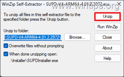 när det är ladda ner när det är slutat. Dubbelklick Vid den nedladdade filen”SUPD-V4-ARM64-X.XX.X.XXXX.EXE”Välj Run och klicka sedan på Unzip .