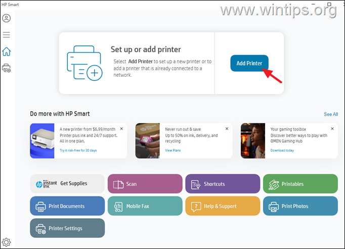 4. Slutligen, när’HP Smart’tvättas, klicka på Lägg till skrivare och följ på skärmen för att installera din skrivare.