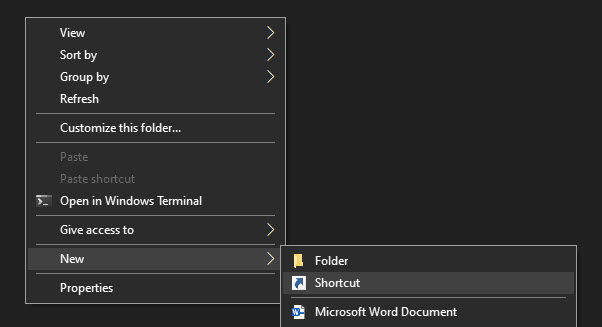 Högerklicka sedan på ett tomt utrymme i mappen (eller på skrivbordet), välj”Ny“och välj sedan”Genväg.”