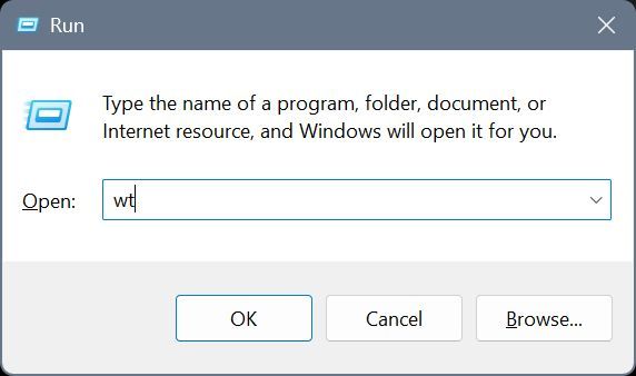 Först måste vi öppna Windows Terminal. För att göra det, tryck på”Windows-tangenten + R“genväg för att öppna dialogrutan Kör, skriv”wt“och klicka på”OK“. Alternativt kan du också högerklicka på”Windows”-ikonen i aktivitetsfältet och välja”Windows Terminal”.