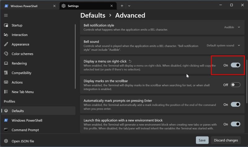 dialog.Skriv”wt“och klicka på”OK“.Klicka på nedåtpilen i namnlisten. Välj alternativet”Inställningar“. Gå till fliken”Standarder“i sidofältet. Klicka på”avancerat”““T. en meny på högerklicka“toggle. Klicka på”Spara“. Från och med nu, högerklicka i Windows Terminal visar högerklicksmenyn.