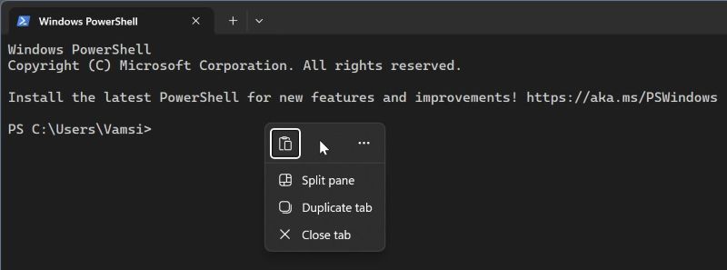 “Med det har du aktiverat terminalens högerklicksmeny. Från och med nu, när du högerklickar i terminalfönstret, öppnas snabbmenyn för högerklick. Den har alternativ för att kopiera, klistra in, hitta, duplicera flikar, delad ruta, webbsökning och stäng flikalternativ.