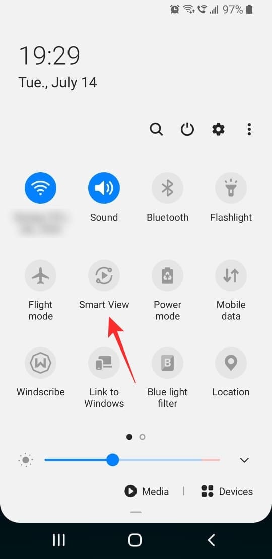 Se till att din Roku-och Android-enhet är anslutna till samma Wi-Fi-nätverk. Svep nedåt från toppen av skärmen på din Android-telefon för att öppna meddelandepanelen. Om du har en Samsung-enhet trycker du på Smart View (Samsungs version av Screen Mirroring) för att aktivera den.