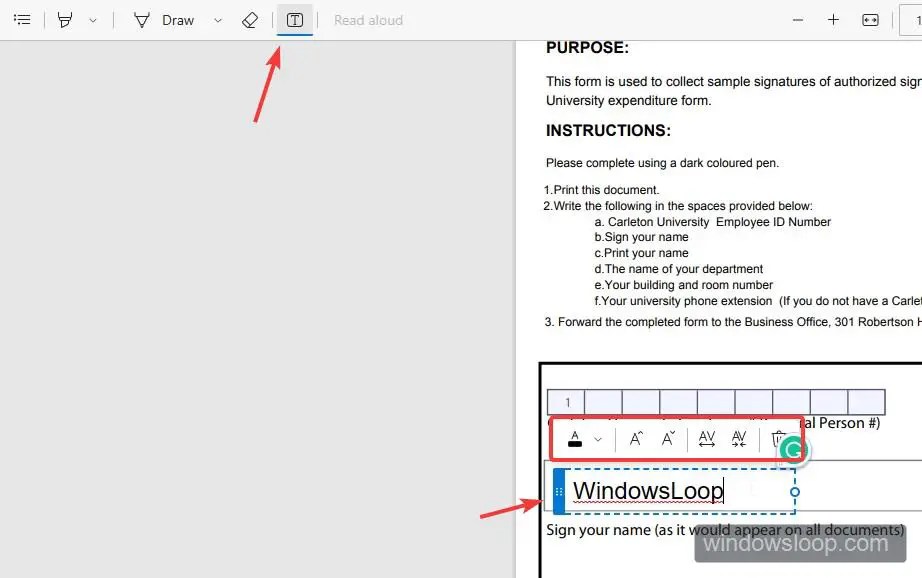 หากคุณไม่ต้องการวาดลายเซ็น คุณสามารถพิมพ์ลงไปได้เช่นกัน ในการทำเช่นนั้น ให้คลิกไอคอน”เพิ่มข้อความ”