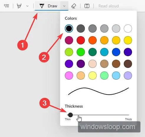 เมื่อ PDF เปิดใน Edge เบราว์เซอร์ คุณจะเห็นเครื่องมือคำอธิบายประกอบมากมายบนแถบนำทางด้านบน จากเครื่องมือที่มีอยู่ ให้คลิกไอคอนวาดเพื่อเลือก จากนั้นคลิกไอคอนแบบเลื่อนลงที่อยู่ถัดจากเครื่องมือนั้น และเลือกสีที่คุณต้องการ ในกรณีส่วนใหญ่ สีดำก็ใช้ได้ หลังจากนั้นให้ใช้แถบเลื่อนความหนาเพื่อกำหนดความหนาของจุด