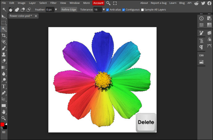 ในทางกลับกัน ลดค่า Tolerance หากไม้กายสิทธิ์เลือกส่วนของภาพที่คุณไม่ต้องการเลือก เมื่อพอใจกับการเลือกแล้ว เพียงกด “Delete”บนแป้นพิมพ์และดูพื้นหลังของคุณหายไป