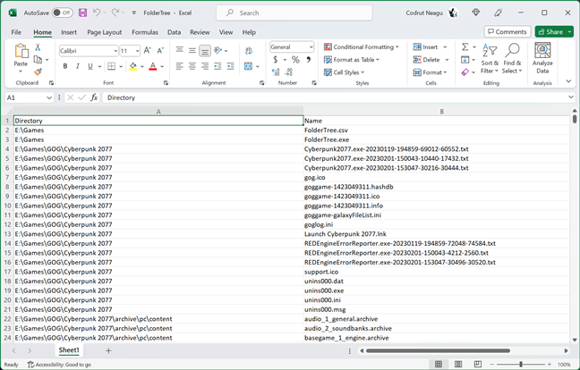 จากนั้นเครื่องมือจะแสดงไฟล์สองไฟล์: FolderTree.xlsx และ FolderTree.csv ทั้งสองไฟล์มี รายการต้นไม้ของโฟลเดอร์และไฟล์ภายในไดเรกทอรีปัจจุบันของคุณ