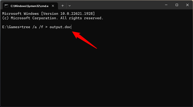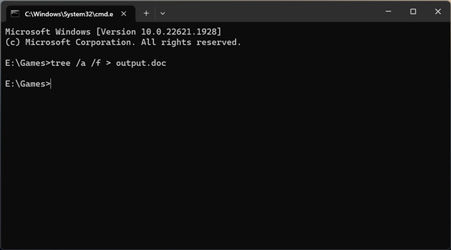 เปิด Command Prompt โดยชี้ไปที่โฟลเดอร์ของคุณ ในกรณีของฉัน Command Prompt เปิดโดยใช้โฟลเดอร์ “E:\Games”หากต้องการส่งออกโครงสร้างของโฟลเดอร์ ให้รันคำสั่งนี้: