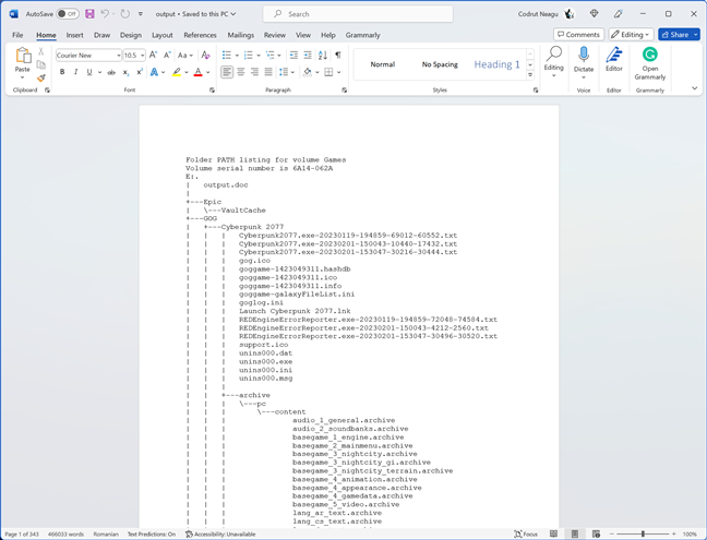 Output.doc คือไฟล์เอกสารที่บันทึกโครงสร้างไดเร็กทอรีทั้งหมด คุณสามารถ ใช้ชื่อใดก็ได้และคุณสามารถระบุประเภทไฟล์ใดก็ได้ตราบเท่าที่มีประเภทไฟล์ข้อความ ฉันชอบใช้ไฟล์ Microsoft Word.doc แต่คุณสามารถใช้ไฟล์ข้อความอื่นได้ ตัวอย่างเช่น คุณสามารถเลือกส่งออกไฟล์ โครงสร้างไดเร็กทอรีเป็นไฟล์.txt อย่างง่ายที่สามารถแก้ไขได้ด้วย Notepad การเรียกใช้คำสั่งนี้อาจใช้เวลาสักครู่ขึ้นอยู่กับจำนวนโฟลเดอร์และไฟล์ที่จัดเก็บไว้ในโฟลเดอร์ของคุณ