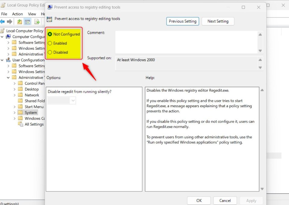 ไม่ได้กำหนดค่า – เหมือนกับ ปิดใช้งาน ผู้ใช้สามารถเข้าถึง Registry Editor (regedit.exe) เปิดใช้ – ผู้ใช้ไม่สามารถเข้าถึง Registry Editor (regedit.exe) ปิดใช้งาน – ผู้ใช้สามารถเข้าถึง Registry Editor (regedit.exe)