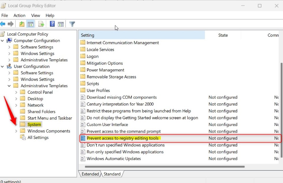 ถัดไป คลิกที่โฟลเดอร์ ระบบ บนแผงด้านซ้าย และดับเบิลคลิกการตั้งค่าทางด้านขวา ที่เรียกว่า “ป้องกันการเข้าถึงเครื่องมือแก้ไขรีจิสทรี“เพื่อเปิด