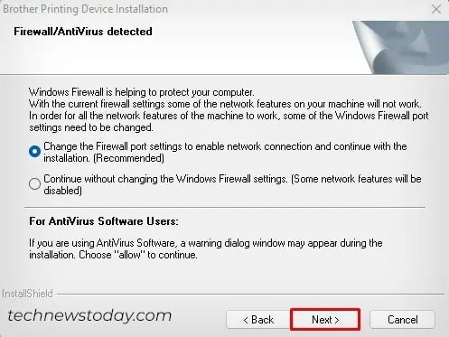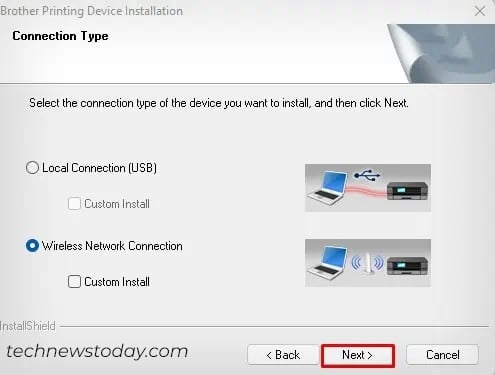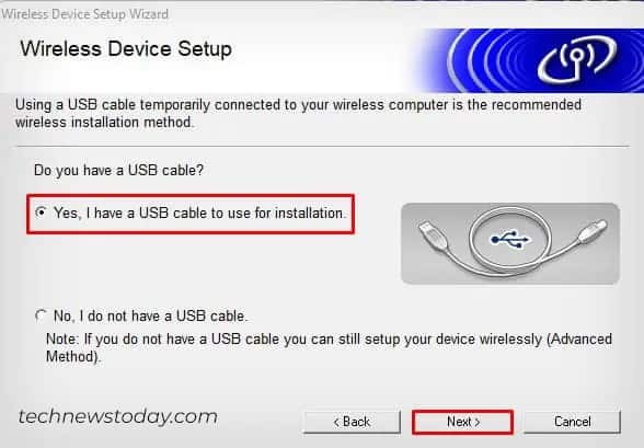 ใช้สาย USB A-B เพื่อเชื่อมต่อเครื่องพิมพ์และคอมพิวเตอร์ของคุณ เปิดเครื่องพิมพ์ เปิด หน้าดาวน์โหลดไดรเวอร์อย่างเป็นทางการของ Brother บน คอมพิวเตอร์. ค้นหาชื่อเครื่องพิมพ์ของคุณ เลือกระบบปฏิบัติการของคุณ คลิกลิงก์ที่ไฮไลต์ดังภาพด้านล่าง เริ่มการดาวน์โหลด เปิดไฟล์การติดตั้ง ยอมรับข้อตกลงใบอนุญาต ทำตามคำแนะนำบนหน้าจอ เมื่อคุณอยู่ที่หน้าจอนี้ ให้เลือก ไร้สาย > ถัดไป เลือกตัวเลือกนี้ เลือกตัวเลือก แนะนำ เลือกตัวเลือกที่ไฮไลต์ ติ๊ก ตรวจสอบและยืนยันแล้ว > ถัดไป คลิก ใช่ > ถัดไป เครื่องพิมพ์ของคุณจะเชื่อมต่อกับเครือข่าย Wi-Fi แล้ว