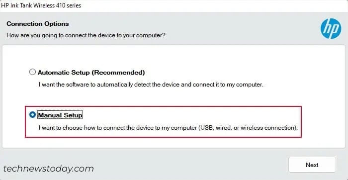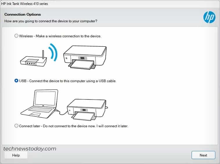 นำสาย USB A-B มาใช้เชื่อมต่อเครื่องพิมพ์กับคอมพิวเตอร์ ไปที่เครื่องพิมพ์ HP หน้าดาวน์โหลดไดรเวอร์ในคอมพิวเตอร์ของคุณ ป้อนชื่อผลิตภัณฑ์ของคุณและส่ง ดาวน์โหลดไฟล์การติดตั้งไดรเวอร์โดยใช้ลิงก์ที่แสดงในภาพด้านล่าง เปิดไฟล์การติดตั้งไดรเวอร์ ปฏิบัติตามคำแนะนำบนหน้าจอต่อไปจนกว่าจะถึงหน้าจอ ตัวเลือกการเชื่อมต่อ เลือก การตั้งค่าด้วยตนเอง > ถัดไป เลือกตัวเลือก ไร้สาย > ถัดไป ยืนยันการใช้เครือข่าย Wi-Fi. ทำตามคำแนะนำบนหน้าจอเพื่อตั้งค่าไร้สายให้เสร็จสมบูรณ์