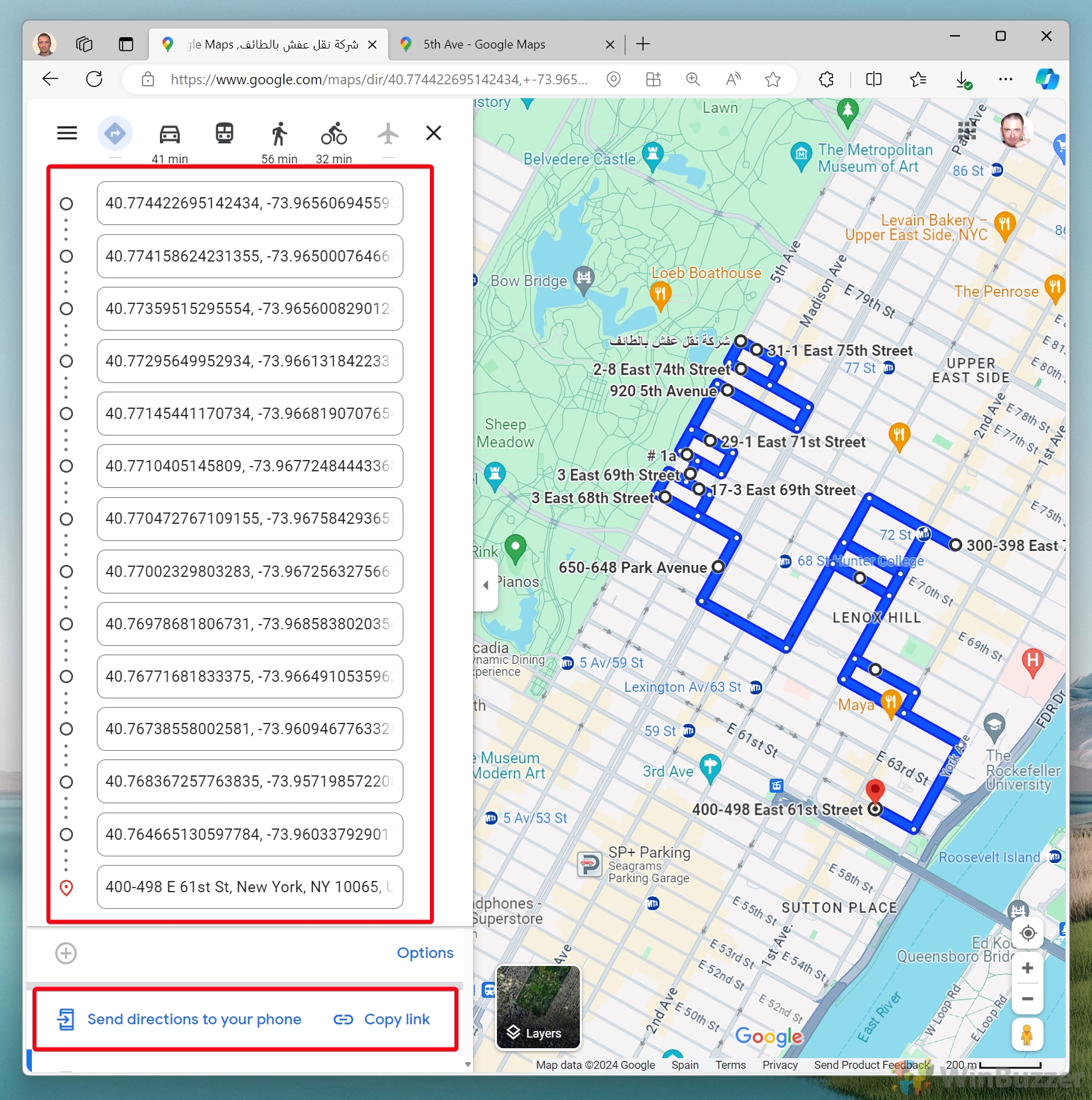 ทำซ้ำสองขั้นตอนก่อนหน้าสำหรับจุดจอดทั้งหมดจนกว่าเส้นทางของคุณจะเสร็จสมบูรณ์ เมื่อคุณทำเสร็จแล้ว กด ENTER หลังจากวางพิกัดสำหรับจุดสุดท้าย สิ่งนี้จะสร้างเส้นทาง คุณสามารถใช้ลิงก์ “ส่งเส้นทางไปยังโทรศัพท์ของคุณ” และ “คัดลอกลิงก์”หลังจากนั้นเพื่อแชร์เส้นทางของคุณหรือเพื่อใช้นำทางบนสมาร์ทโฟนของคุณ