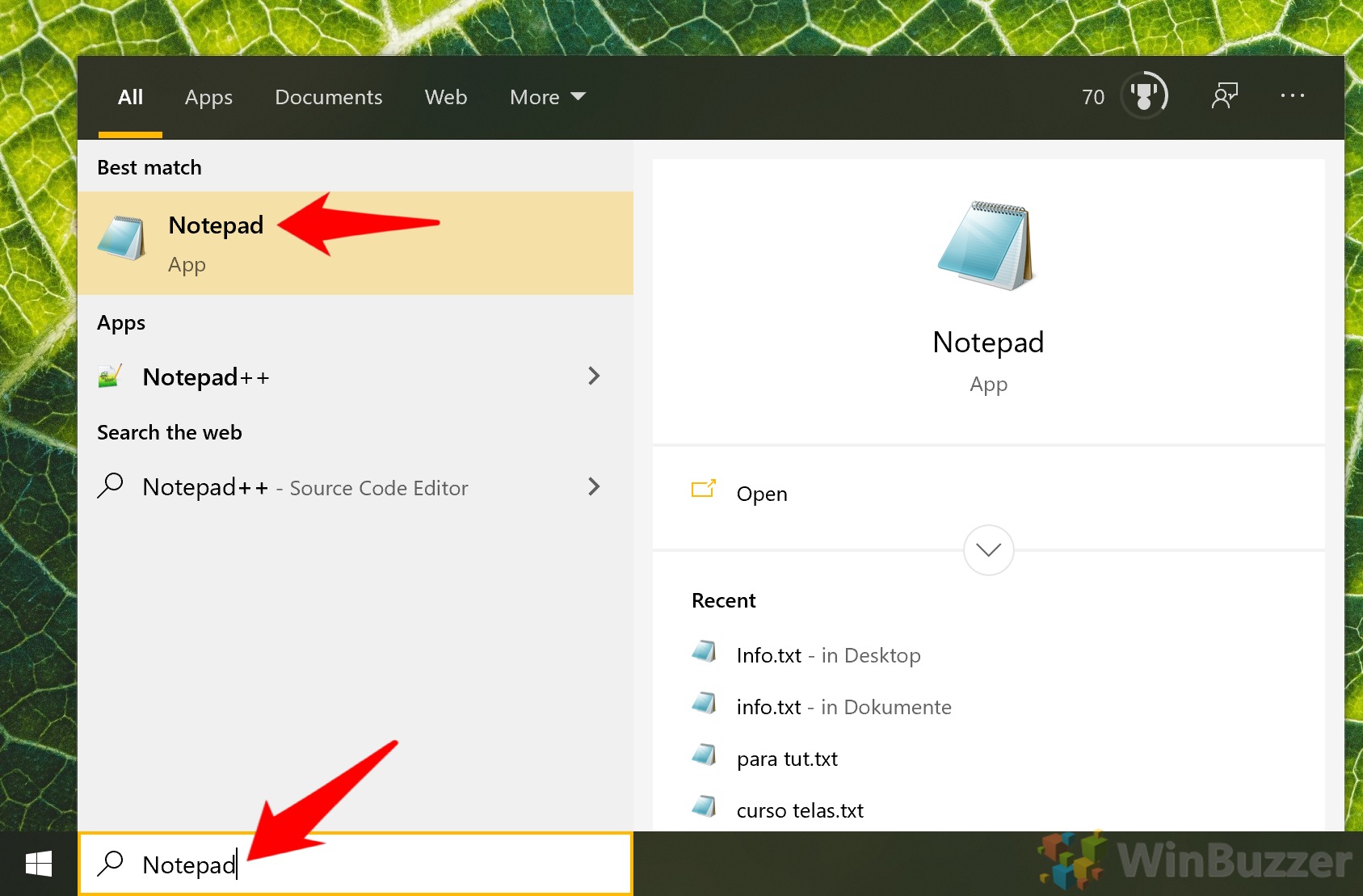 กด Start แล้วพิมพ์ “Notepad”. คลิกที่ผลลัพธ์ด้านบน