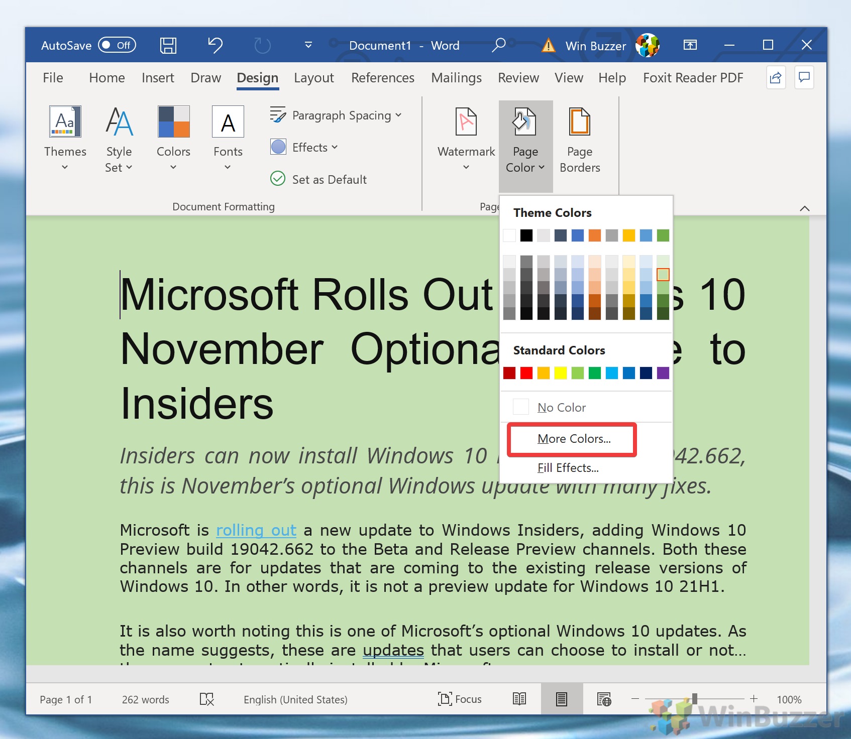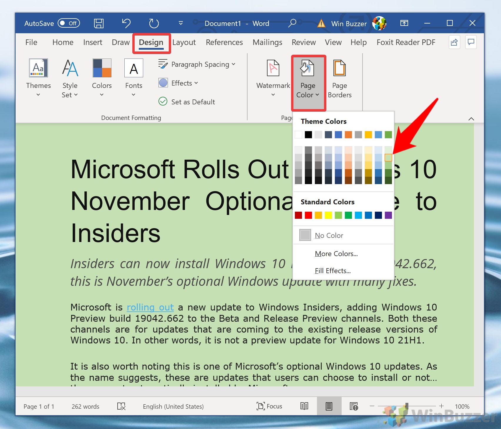 นำทางไปยังแท็บ “การออกแบบ” ใน Microsoft Word ที่ด้านขวาของริบบิ้น คุณจะพบปุ่ม “สีของหน้า” การคลิกปุ่มนี้จะแสดงชุดตัวอย่างสีที่กำหนดไว้ล่วงหน้า