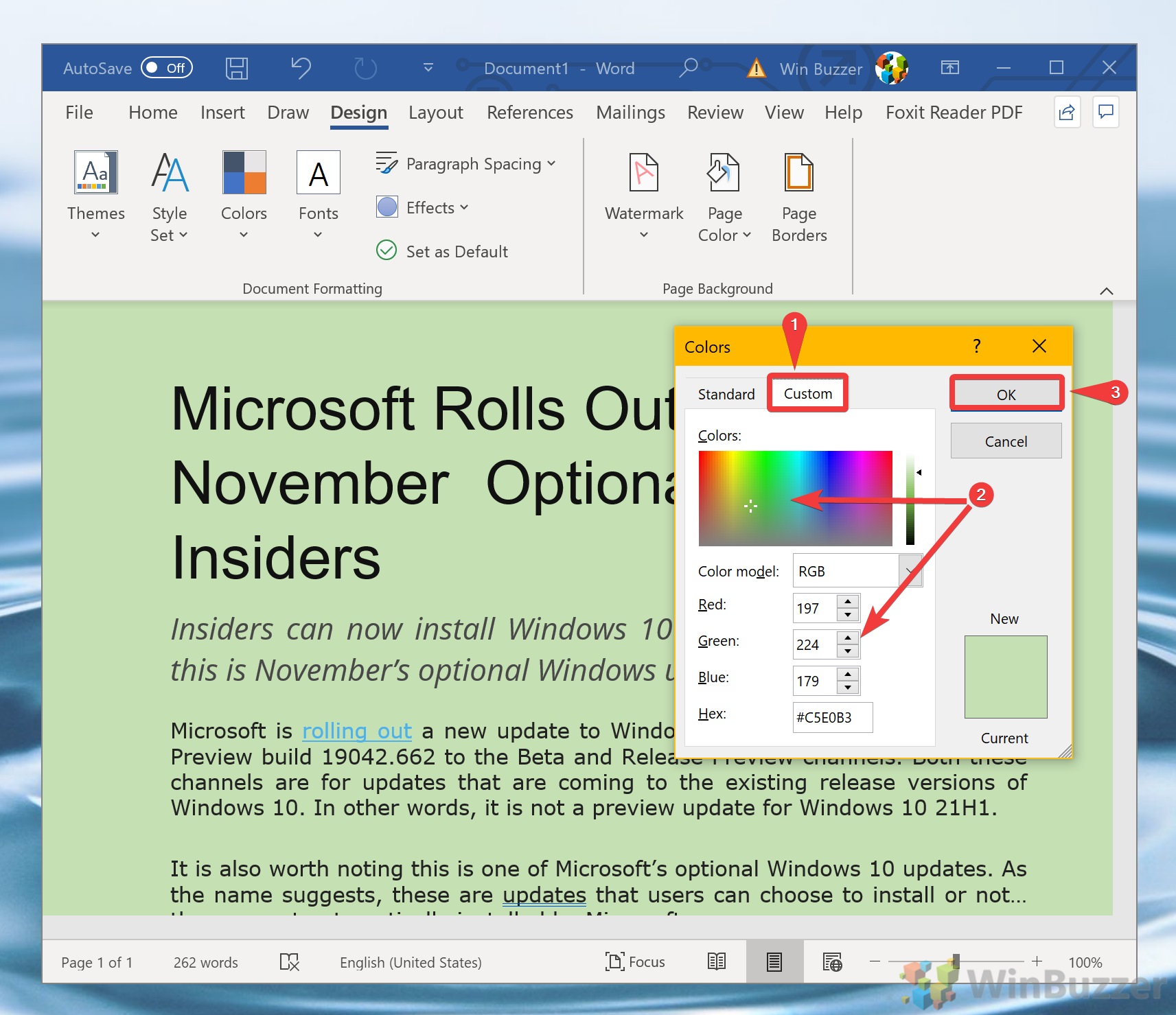 เพื่อให้ตรงกับสีพื้นหลังของ เอกสารของคุณที่มีสีในรูปภาพ คุณจะต้องระบุรหัสสีที่ถูกต้อง (RGB หรือฐานสิบหก) จากรูปภาพก่อนโดยใช้ซอฟต์แวร์แก้ไขรูปภาพ เมื่อคุณมีรหัสสีแล้ว ให้ใช้ตัวเลือก “สีเพิ่มเติม…“ใต้ “สีของหน้า“ในแท็บออกแบบของ Word ป้อนค่า RGB เฉพาะหรือรหัสฐานสิบหกเพื่อให้สีพื้นหลังตรงกับรูปภาพของคุณ
