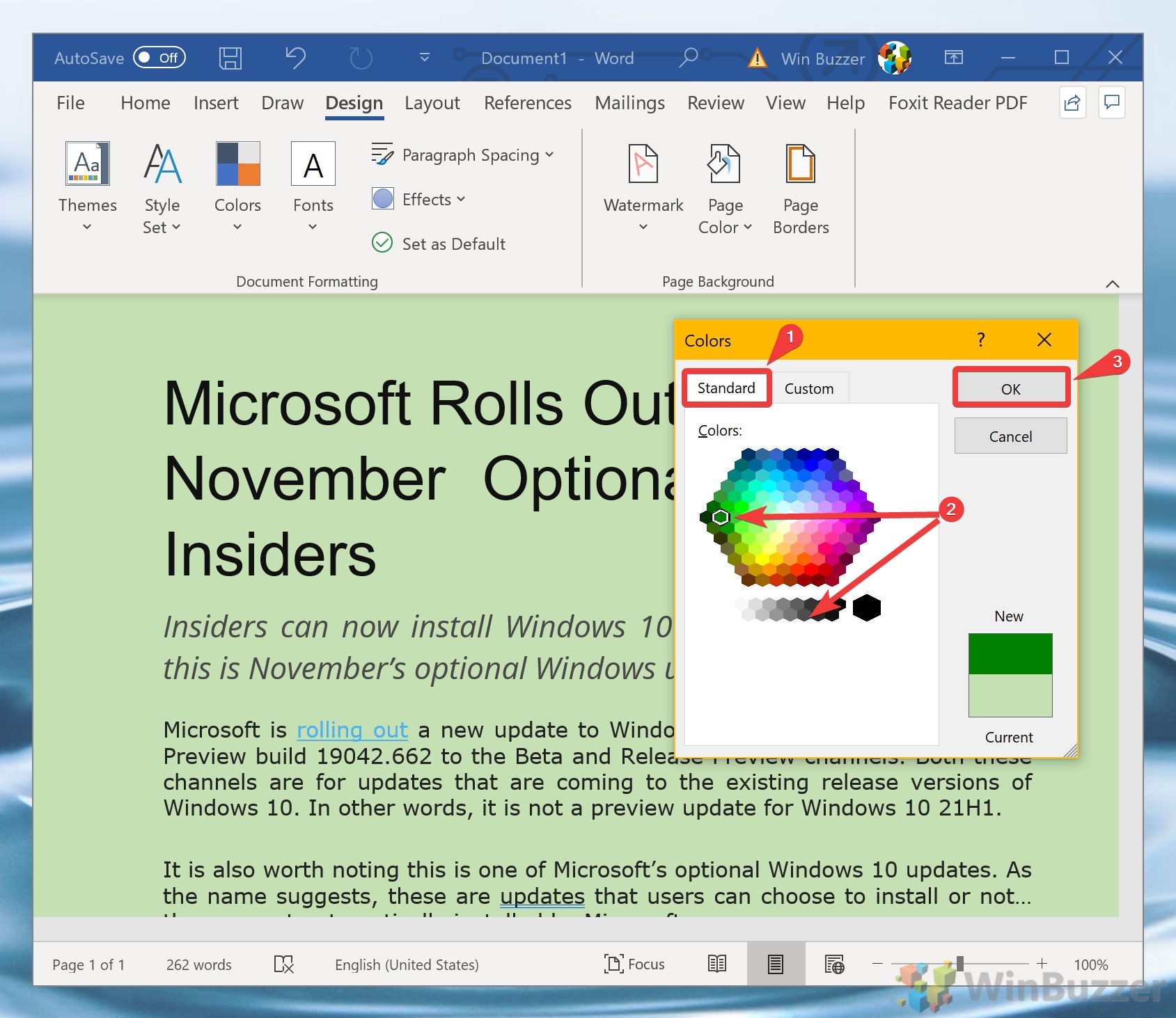 อีกทางหนึ่ง แท็บ “มาตรฐาน” มีตัวเลือกสีและเฉดสีที่ใช้กันทั่วไป เรียกดูตัวเลือกเหล่านี้ เลือกตัวเลือกที่เหมาะกับเอกสารของคุณมากที่สุด แล้วกด “ตกลง” เพื่อนำไปใช้