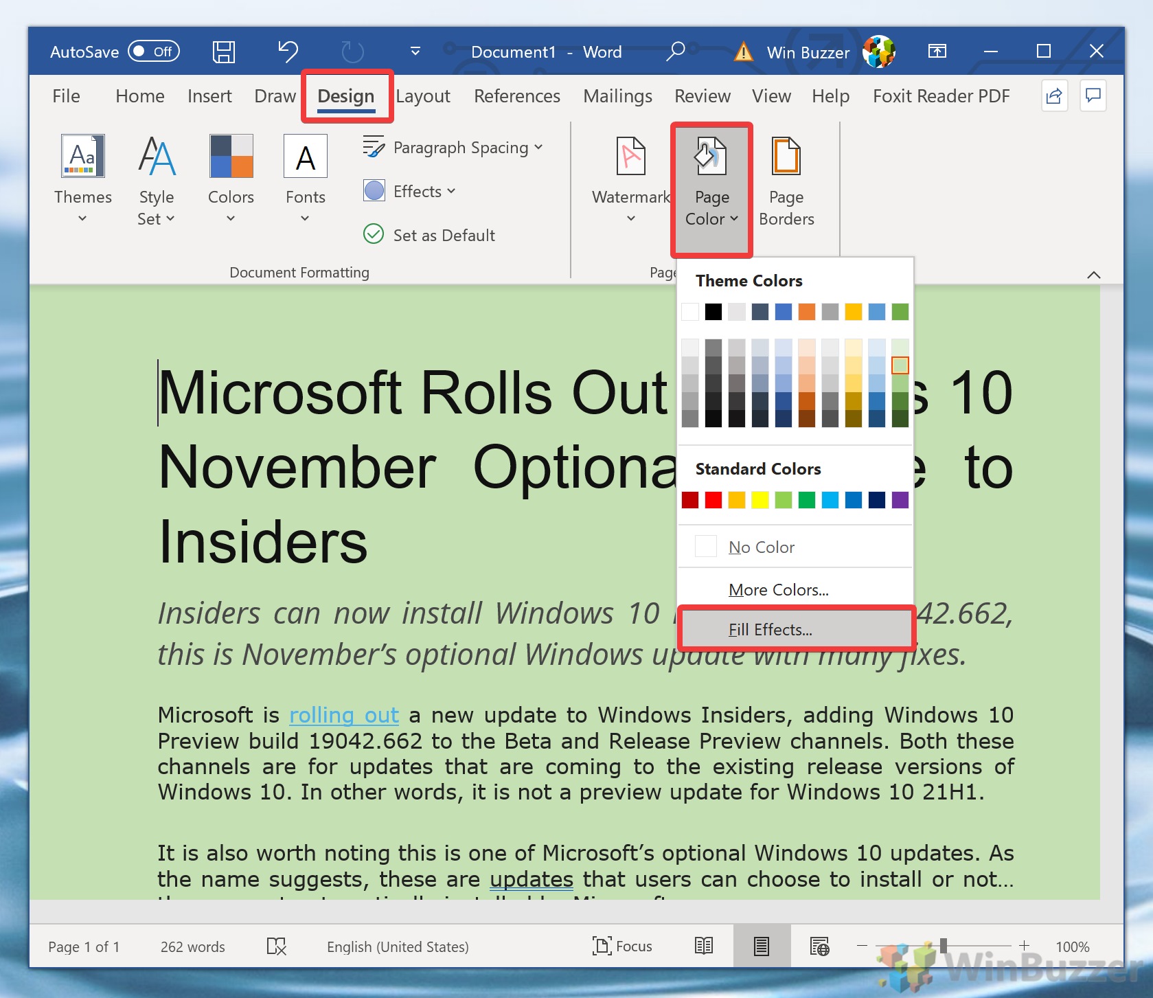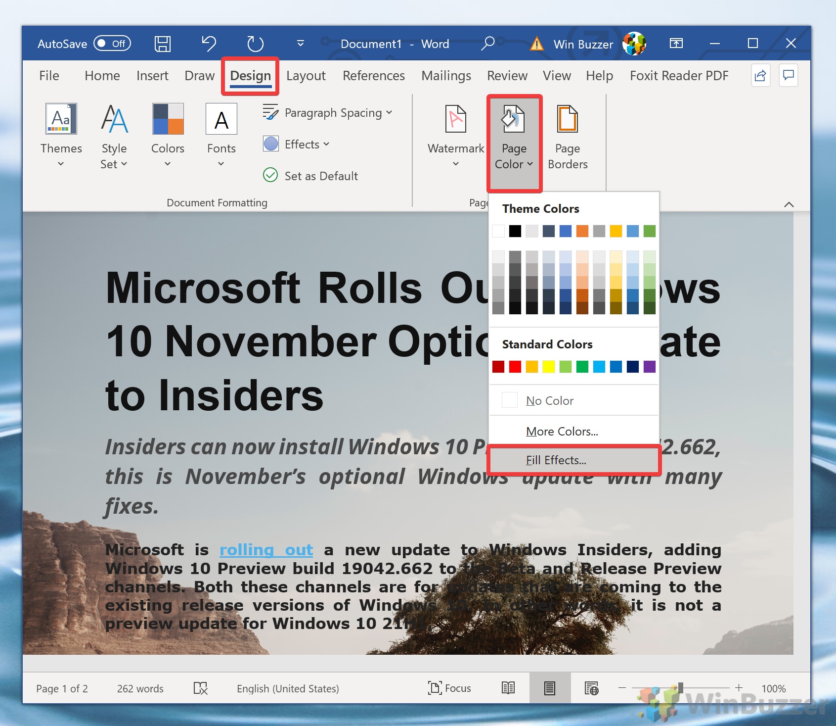 ใต้ “การออกแบบ” ค้นหาปุ่ม “สีของหน้า” คลิกปุ่มนั้น จากนั้นเลือก “เติมเอฟเฟ็กต์…” จากเมนูแบบเลื่อนลง การดำเนินการนี้จะเปิดหน้าต่างใหม่พร้อมตัวเลือกการเติมต่างๆ