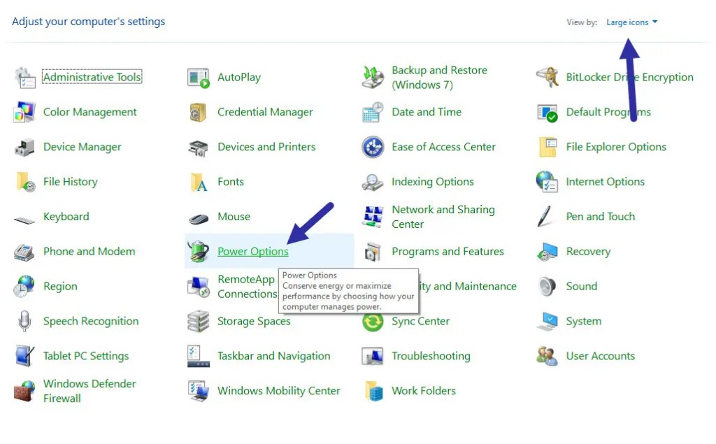 ขั้นตอนที่ 2: หลังจากเปิดหน้าต่างแผงควบคุม ให้เลือก”ไอคอนขนาดใหญ่”จากเมนู”ดูตามเมนูแบบเลื่อนลง จากนั้น ค้นหาและคลิกการตั้งค่า”ตัวเลือกพลังงาน”ในหน้าต่างแผงควบคุม