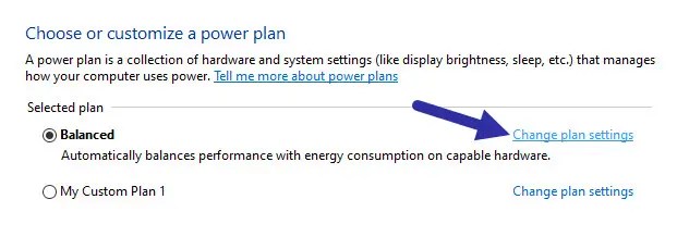 ขั้นตอนที่ 3: การดำเนินการข้างต้นจะเปิด Windows Power Plan หน้าการตั้งค่า ที่นี่ คลิกลิงก์ “เปลี่ยนการตั้งค่าแผน” ถัดจากแผนที่ใช้งานอยู่ คุณสามารถจดจำแผนที่ใช้งานอยู่ได้โดยดูที่ตัวเลือกวิทยุที่เลือกไว้