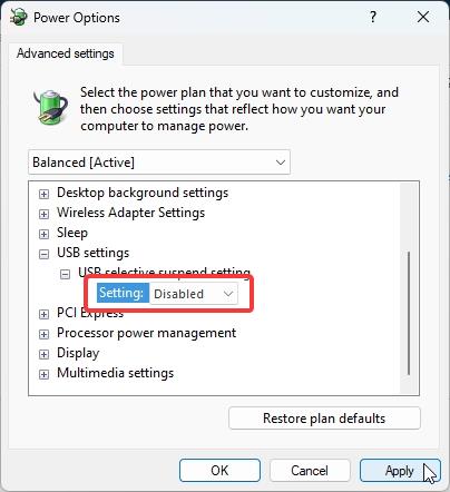 เปิด แผงควบคุม เลือก ตัวเลือกการใช้พลังงาน คลิก เปลี่ยนการตั้งค่าแผน ถัดจากแผนการใช้พลังงานของคุณ คลิกที่ เปลี่ยนการตั้งค่าพลังงานขั้นสูง ขยายส่วน การตั้งค่า USB ขยาย การตั้งค่าการระงับการเลือก USB ส่วน เลือก ปิดใช้งาน จากเมนูแบบเลื่อนลง คลิก ตกลง.รีสตาร์ท คอมพิวเตอร์ของคุณ