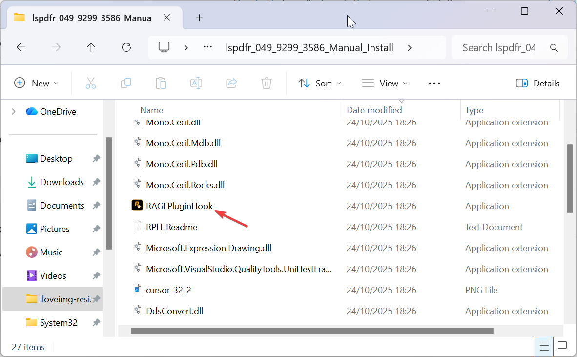 โฟลเดอร์ LSPDFR ที่มีโฟลเดอร์เสียง ตัวอักษร และข้อมูล โฟลเดอร์ปลั๊กอินที่มี LSPD First Response.dll อยู่ข้างใน ไฟล์ RAGEPluginHook.exe